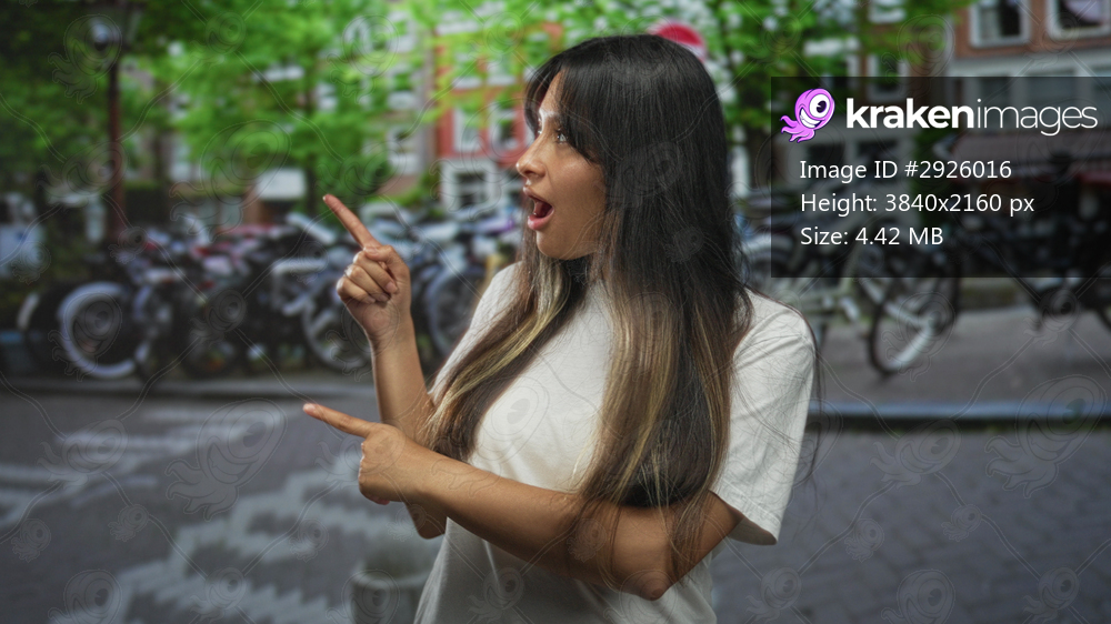 Hispanic woman points finger with both hands on street in amsterdam near parked bicycles and canal houses; surprise discovery.