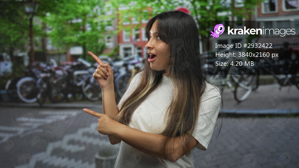 Hispanic woman points finger with both hands on street in amsterdam near parked bicycles and canal houses; surprise discovery.