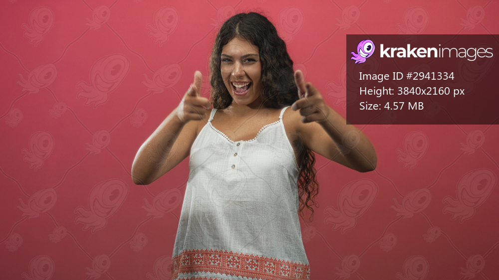 Hispanic woman points finger guns with visible hands and smiling face in a white sundress against a pink backdrop in studio; playful confidence.