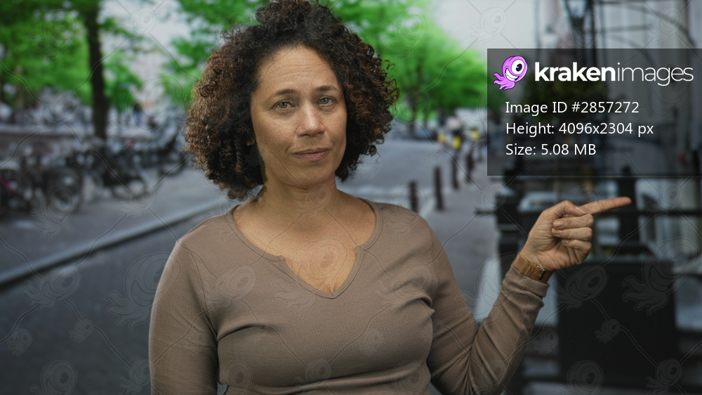 Hispanic woman points finger on narrow tree lined city street with bicycles and lampposts; attention.
