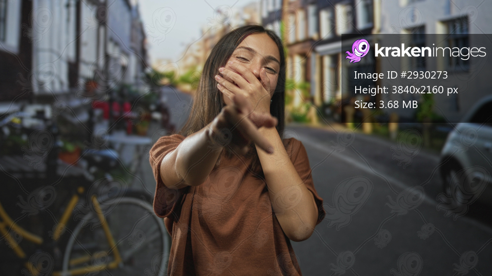 Hispanic woman points finger on street in brown t shirt, laughing and covering mouth with hand; playful.