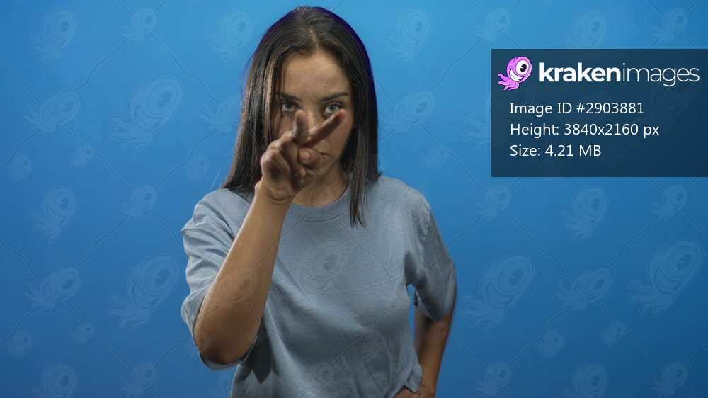 Hispanic woman points finger with one hand on hip against a blue studio backdrop; frustration defiance.
