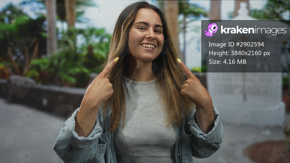 Hispanic woman points finger to teeth and smiles at park fountain while showing yellow nails and denim shirt; happiness confidence.