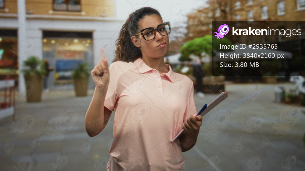 Hispanic woman points index finger while holding a clipboard and pen on a street cafe plaza; confidence authority instruction.