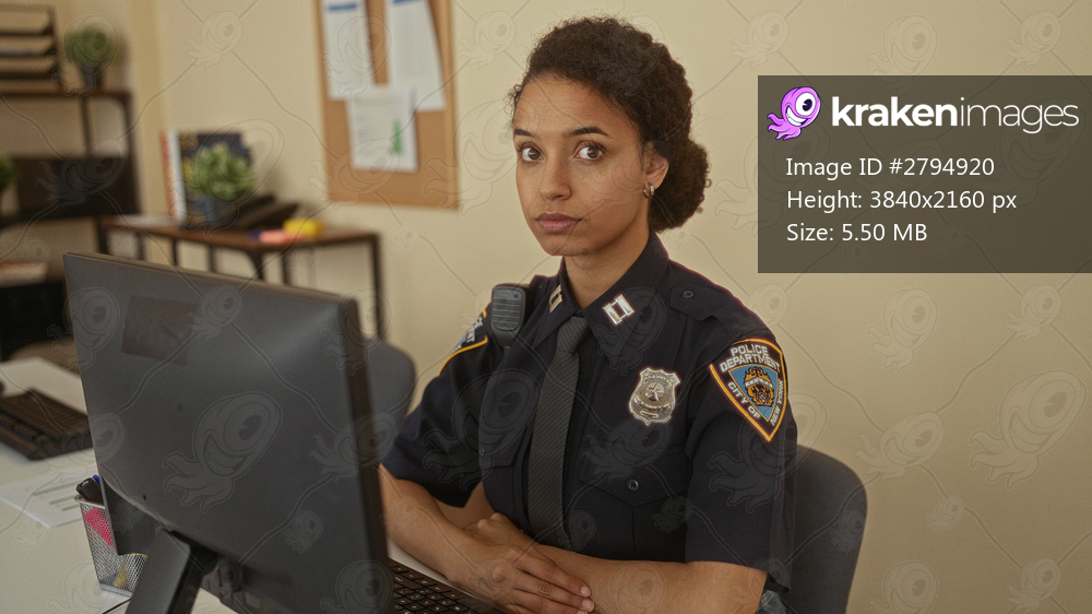 Hispanic woman police officer in dark blue uniform places finger to lips for silence in station building; quiet vigilance.