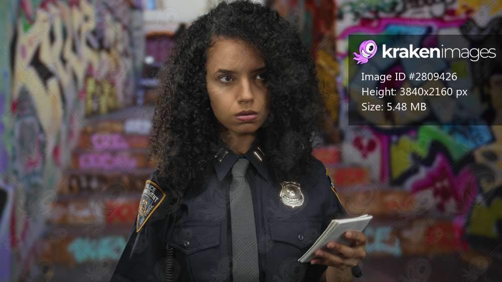 Hispanic woman police officer in uniform stands on graffiti-covered street taking notes with a calm expression, highlighting urban law enforcement in a creative outdoor setting. - Kraken Images
