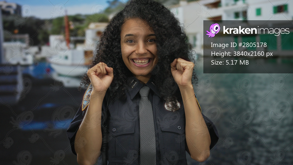Hispanic woman police officer smiling joyfully in uniform at a seaside port with boats in the background.