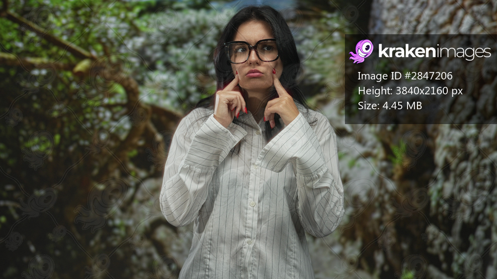 Hispanic woman presses her cheeks with red manicured fingers while standing among winding tree roots in lush forest; playful joy.