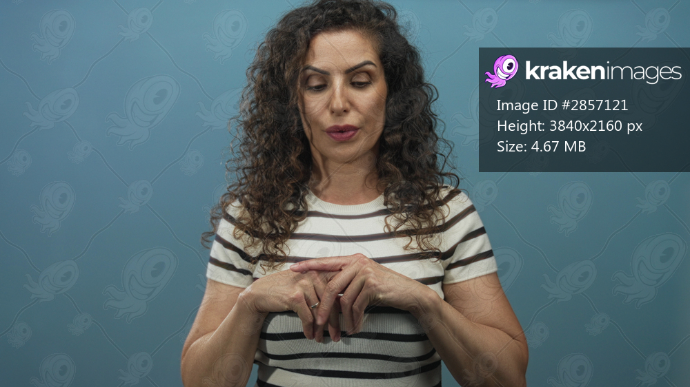 Hispanic woman pressing both index fingers together at chest level in studio with solid blue background; anxiety.
