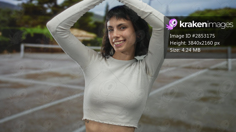 Hispanic woman raises arms overhead on outdoor tennis court in sportswear with net and greenery behind; joy.