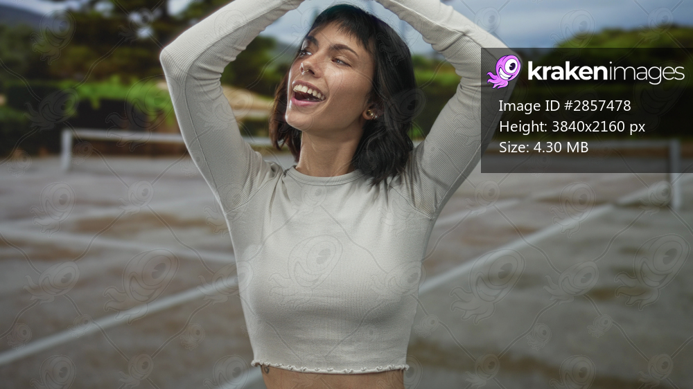 Hispanic woman raises arms overhead on outdoor tennis court in sportswear with net and greenery behind; joy.
