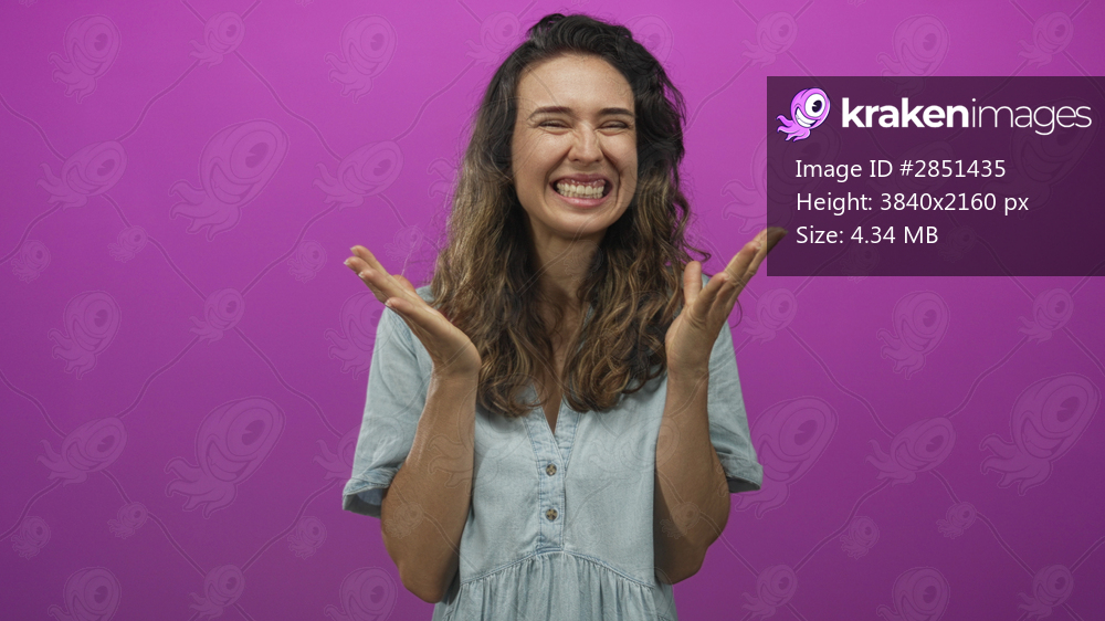 Hispanic woman raises clenched fists and spreads open palms in a vibrant purple studio scene; excitement triumph celebration.