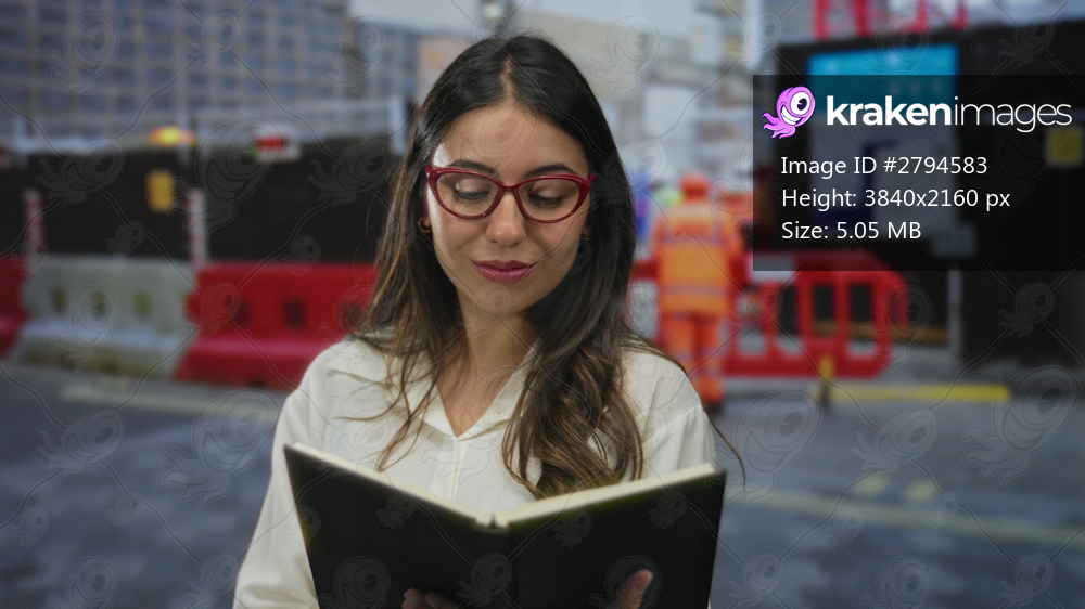 Hispanic woman reading a book at a construction site with safety barriers and blurred workers in the background outdoor setting.