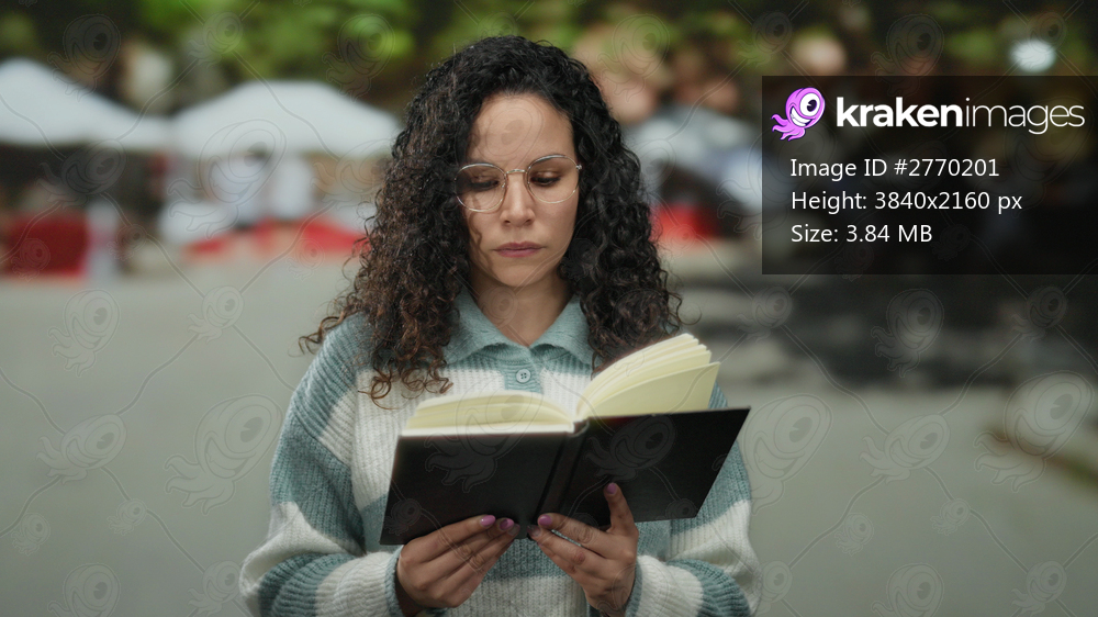 Hispanic woman reading book outdoors on city street, surrounded by trees and blurred background for calm and focus.