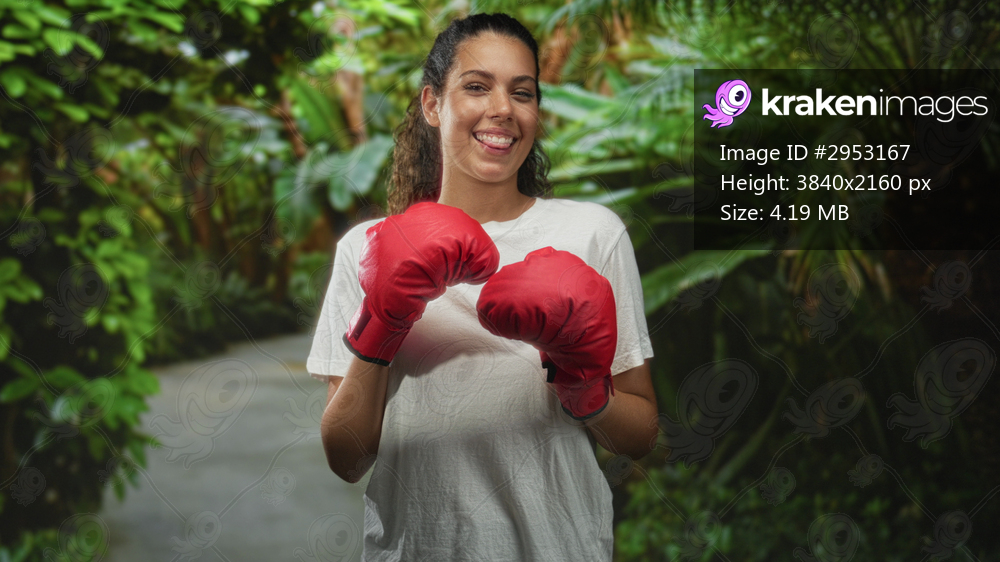 Hispanic woman with red boxing gloves holding fists up on a forest path, smiling and sticking out tongue; confidence empowerment.