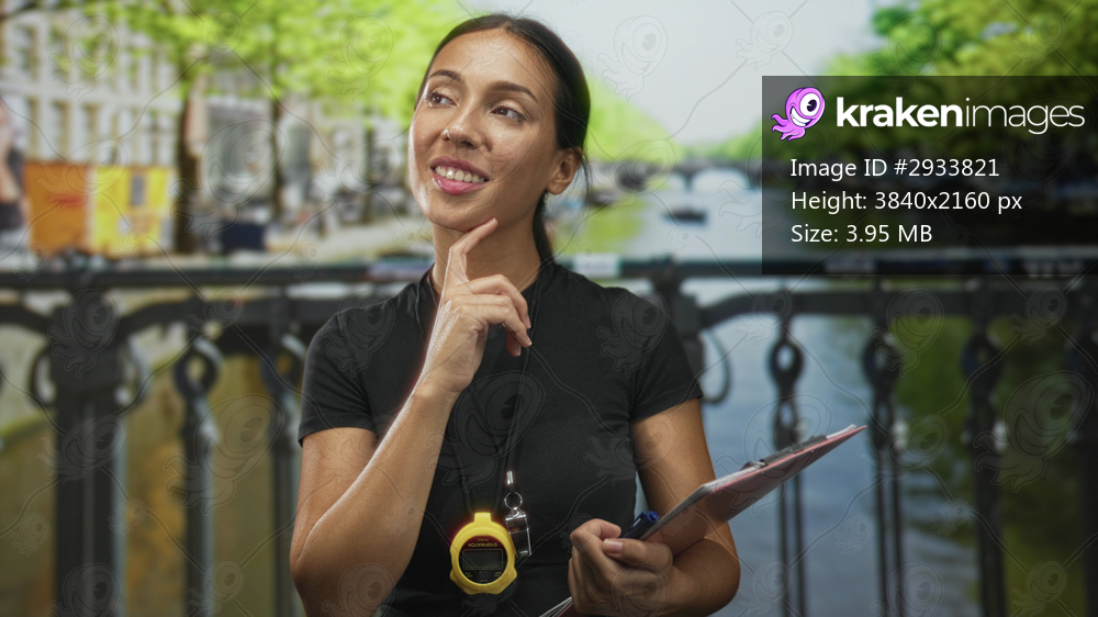 Hispanic woman referee with whistle and stopwatch holding clipboard, finger to chin for thinking on a street in amsterdam; thoughtful planning.