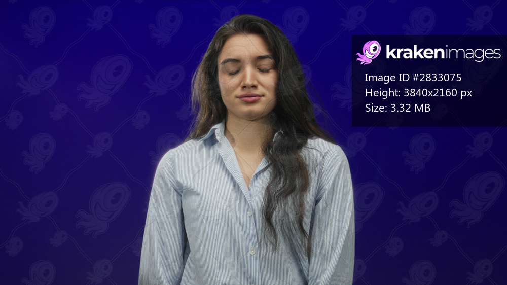Hispanic woman rolls eyes upward revealing bare neck and parted lips in blue studio; annoyance boredom.