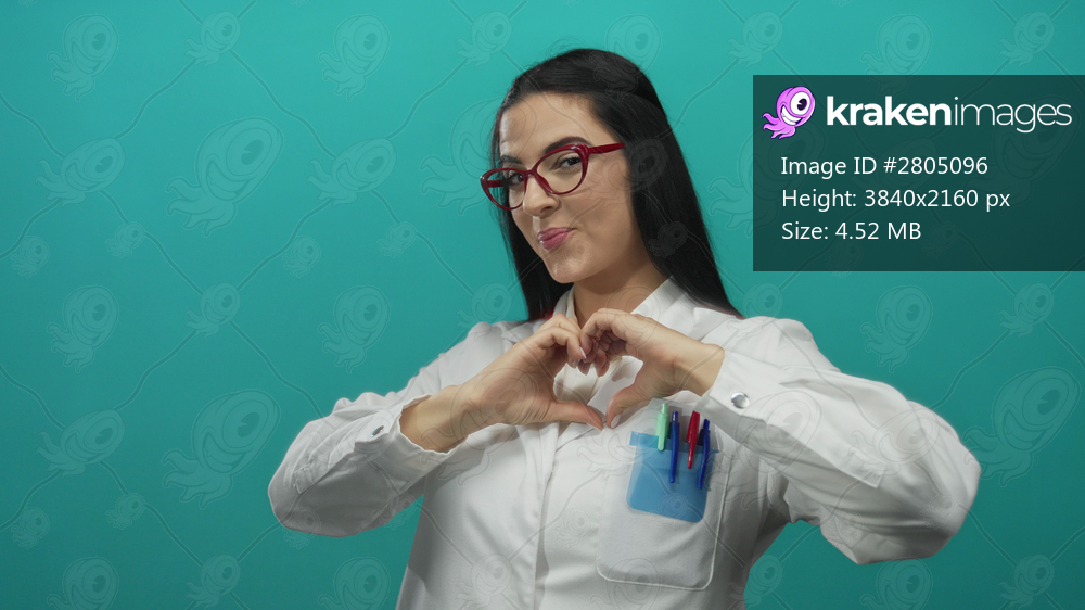 Hispanic woman scientist in a lab coat gestures heart hands against a green background, smiling and wearing glasses, expressing positivity and professionalism. - Kraken Images