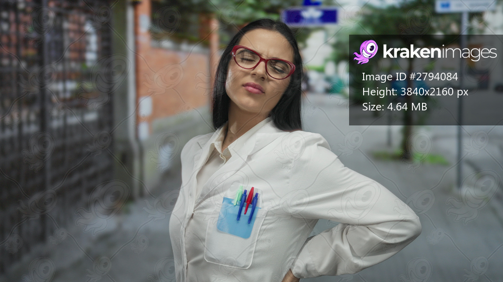 Hispanic woman scientist in glasses and lab coat grimaces in discomfort on a city street, highlighting the urban setting and scientific profession.