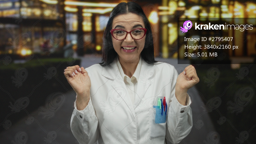 Hispanic woman scientist in lab coat reacting excitedly on a city street at night with bright lights behind her.