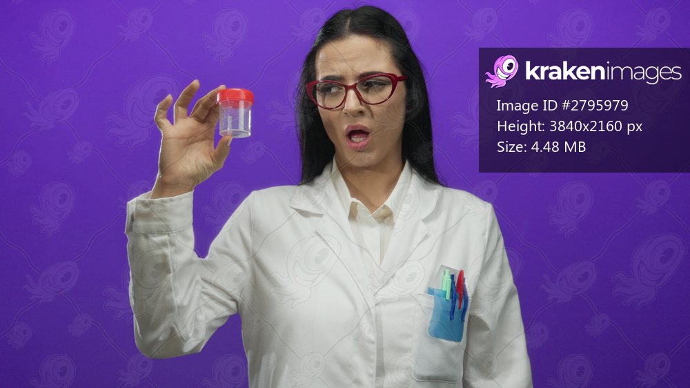 Hispanic woman scientist in uniform examines test tube against purple wall, displaying curiosity and concentration.