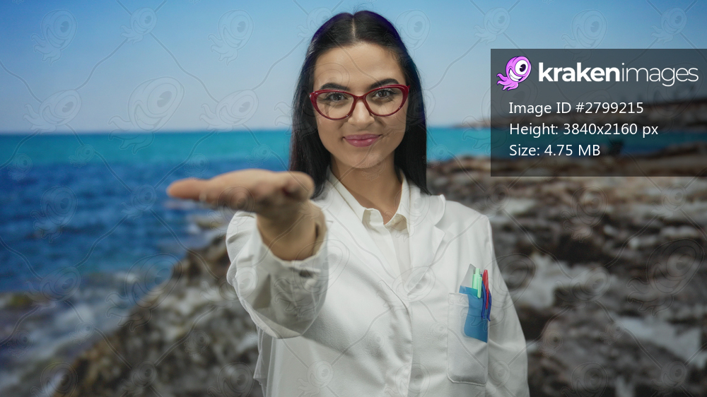 Hispanic woman scientist in uniform extends hand towards camera on seaside beach, showcasing a vibrant coastal background and professional attire.
