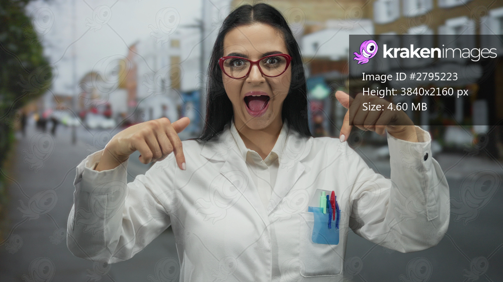 Hispanic woman scientist in uniform gestures on a bustling street, embodying excitement and engagement in an outdoor urban setting.