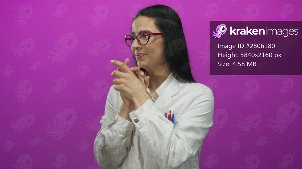 Hispanic woman scientist in white uniform appears concerned against a vivid pink wall.