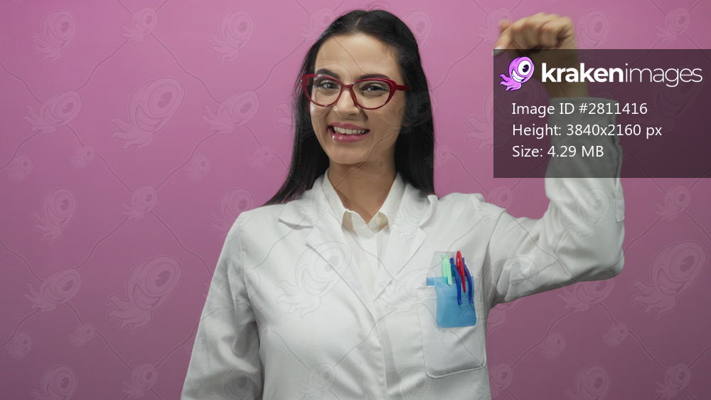 Hispanic woman scientist in white uniform enthusiastically points down against a vibrant pink wall, wearing red glasses and smiling confidently with pens in her pocket. - Kraken Images