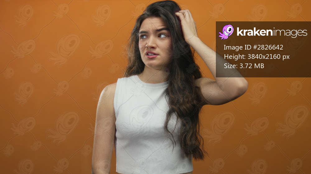 Hispanic woman scratches head and hair while gazing sideways in studio under bright lights; confusion.