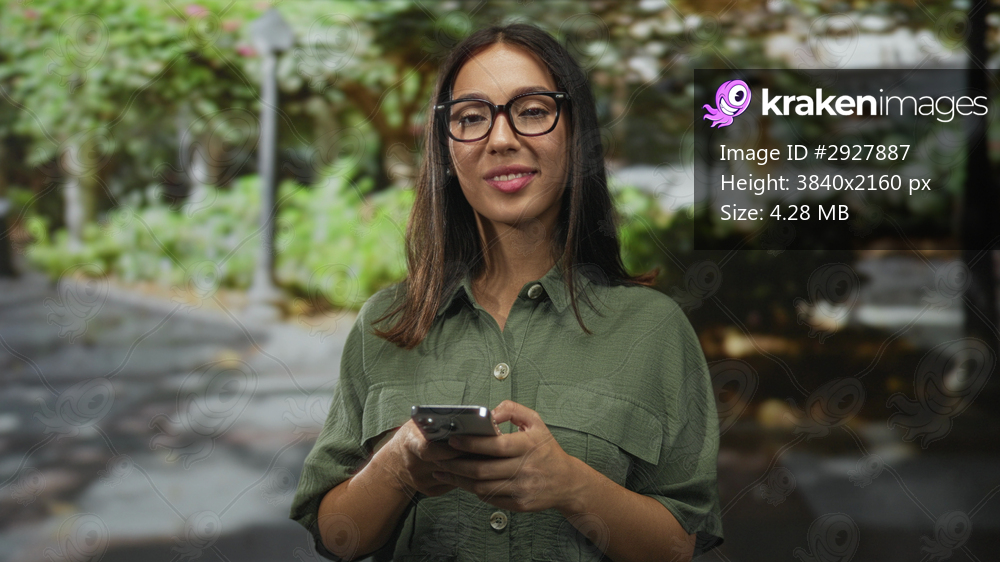 Hispanic woman scrolling smartphone with both hands while smiling on a street beside park greenery and lamppost; calm connection.