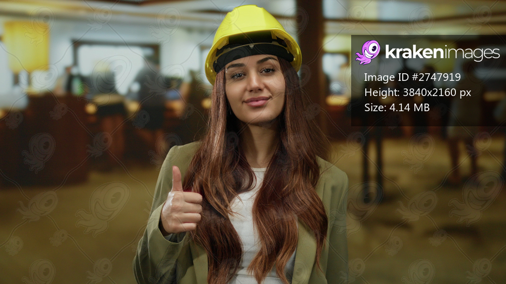 Hispanic woman showcasing hotel interior while wearing a hard hat, symbolizing architecture and engineering, with a confident gesture.