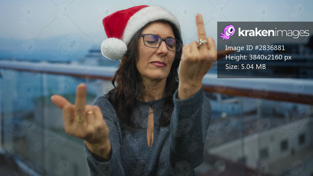Hispanic woman shows both middle fingers in front of a ship railing on building deck; anger defiance.