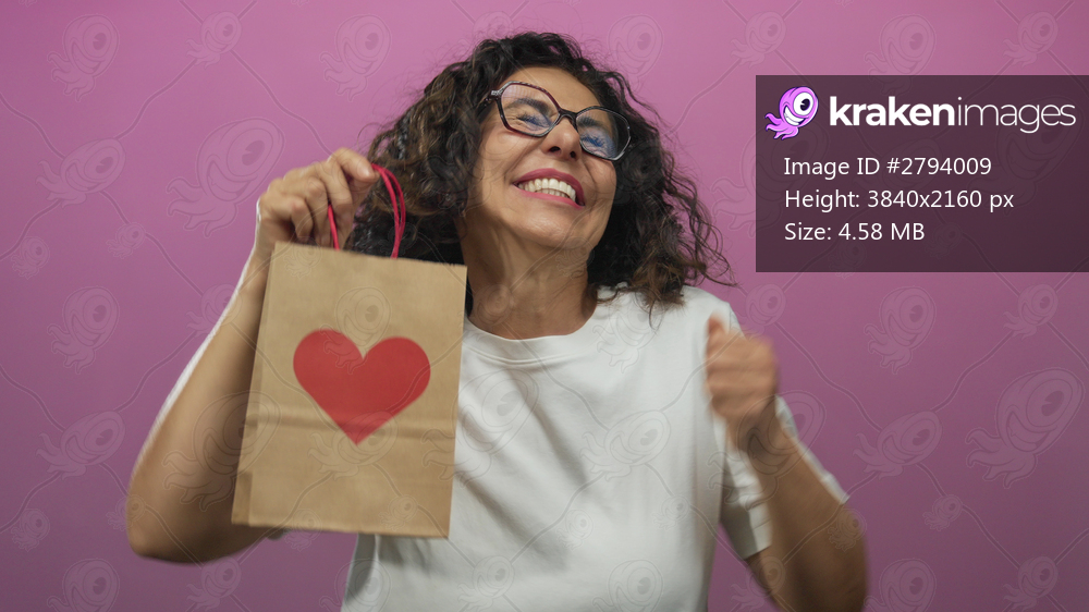 Hispanic woman shows excitement holding a heart-adorned paper bag against an isolated pink background wall.