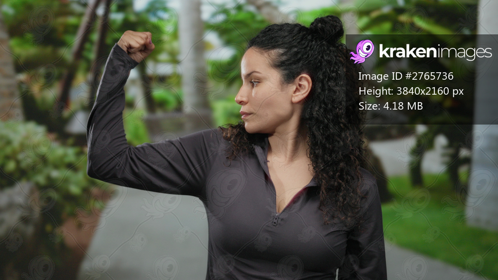 Hispanic woman shows strength gesture in a lush outdoor park setting, embodying confidence and empowerment amidst vibrant green surroundings and casual attire. - Kraken Images