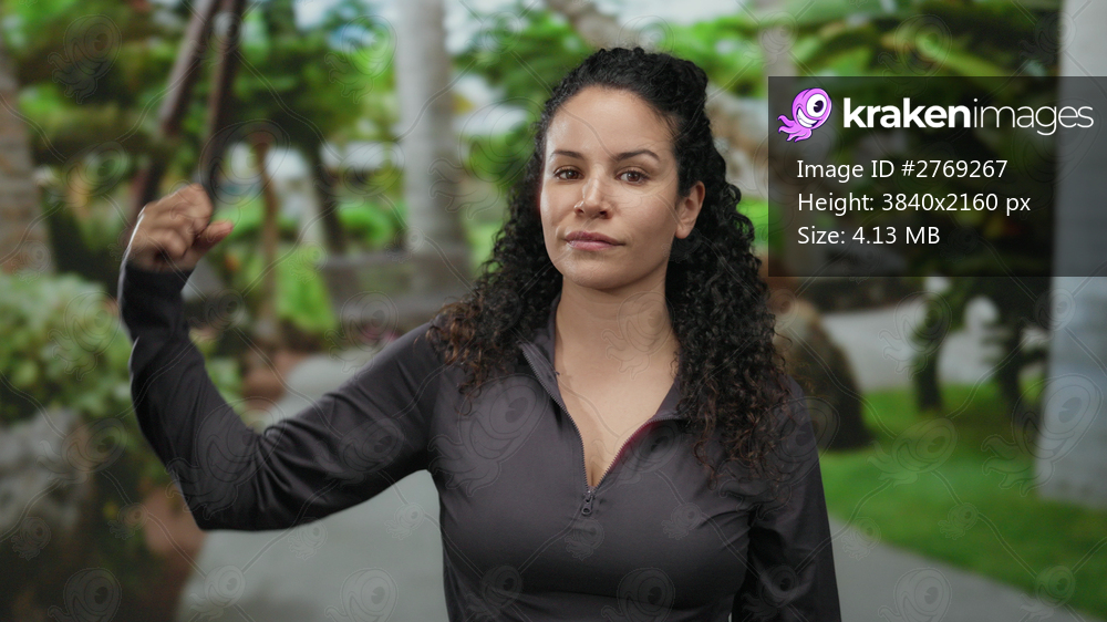Hispanic woman shows strength gesture in a lush outdoor park setting, embodying confidence and empowerment amidst vibrant green surroundings and casual attire. - Kraken Images