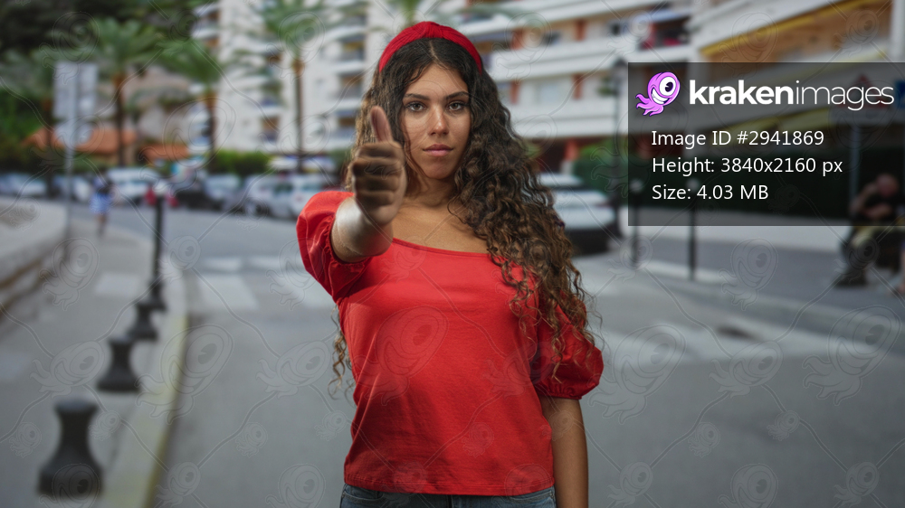 Hispanic woman shows thumbs up with outstretched hand at a city street crosswalk; confidence approval.