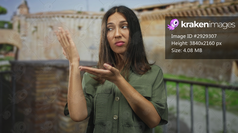 Hispanic woman shrugging on an old town street in a green shirt with closed eyes; disapproval doubt mistrust.