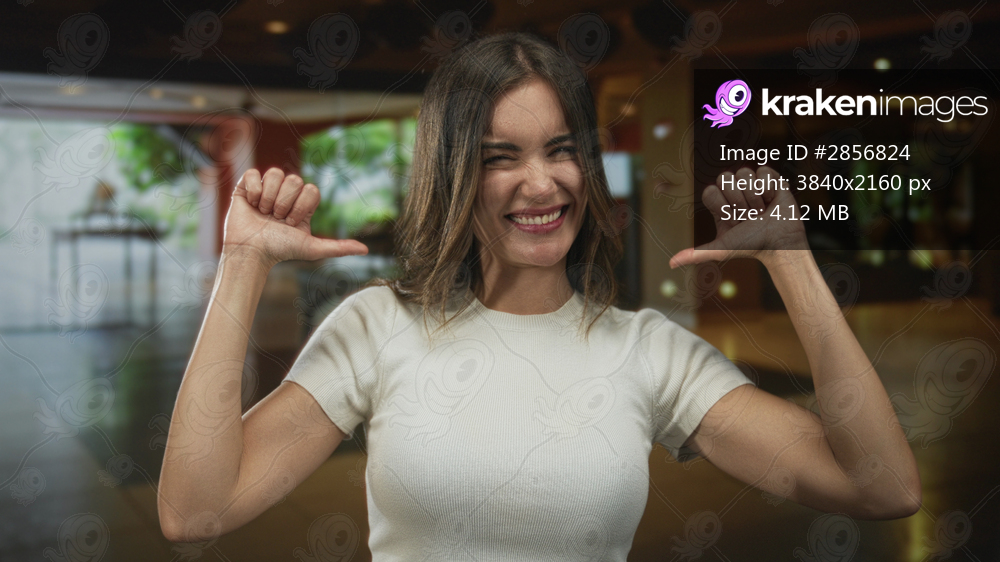 Hispanic woman smiles while pointing both thumbs at herself inside a hotel building under warm lighting; confidence.