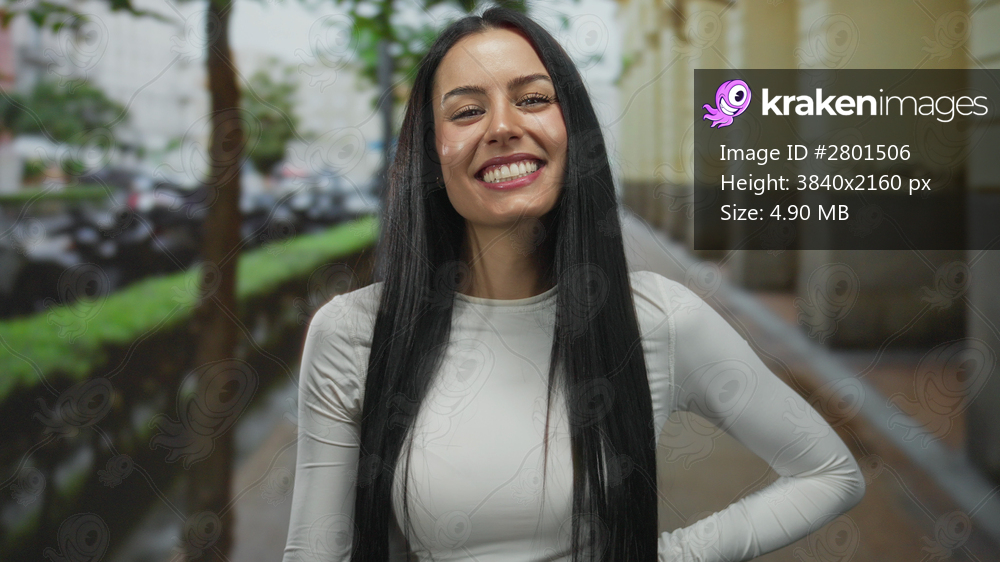 Hispanic woman smiling brightly outdoors on a city street surrounded by urban architecture on a sunny day.