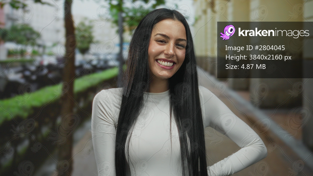 Hispanic woman smiling brightly outdoors on a city street surrounded by urban architecture on a sunny day.