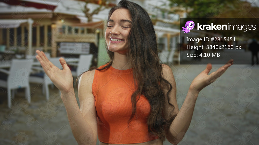 Hispanic woman smiling broadly and raising her hands with open palms at outdoor restaurant terrace; pure joy.