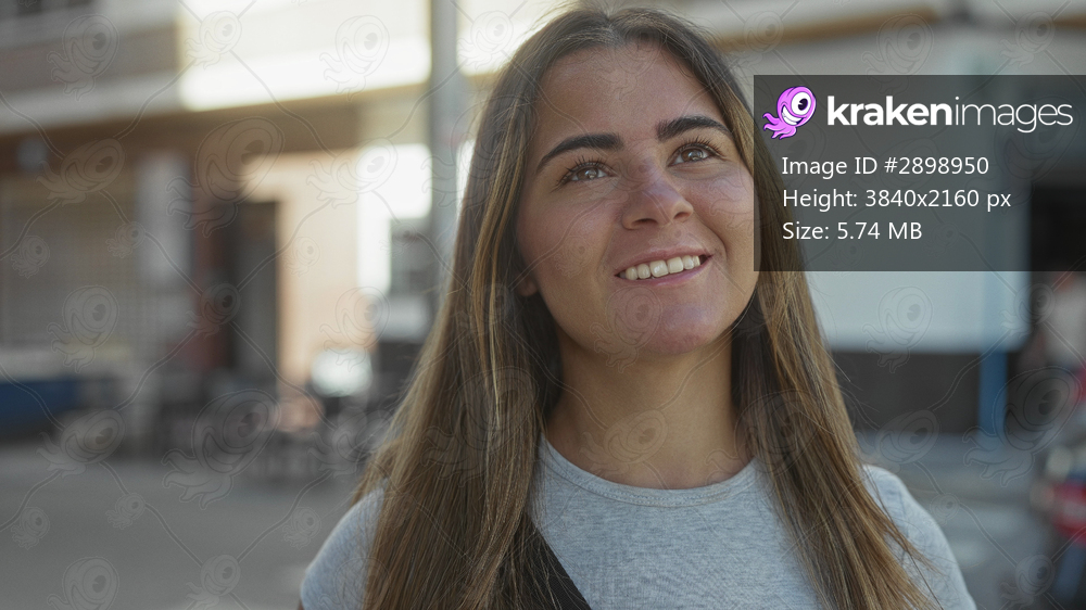 Hispanic woman smiling with face tilted up, looking upward on a city street with shoulderbag strap across chest; joyful optimism.