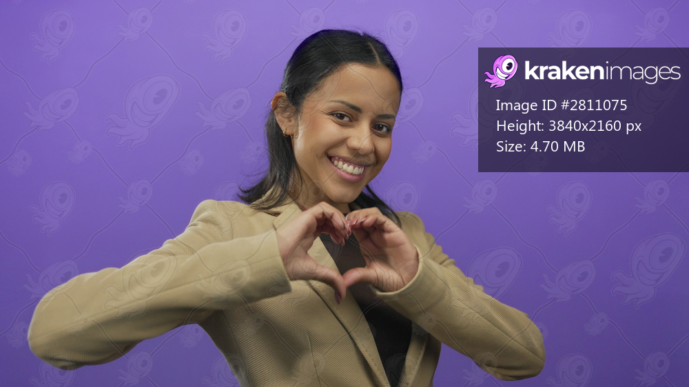 Hispanic woman smiling and forming a heart with her hands against a vibrant purple background in a studio setting, embodying positivity and connection. - Kraken Images