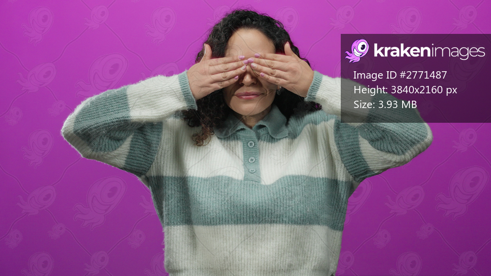 Hispanic woman smiling with glasses against a pink background, wearing a striped sweater, expresses playful cheerfulness and excitement.