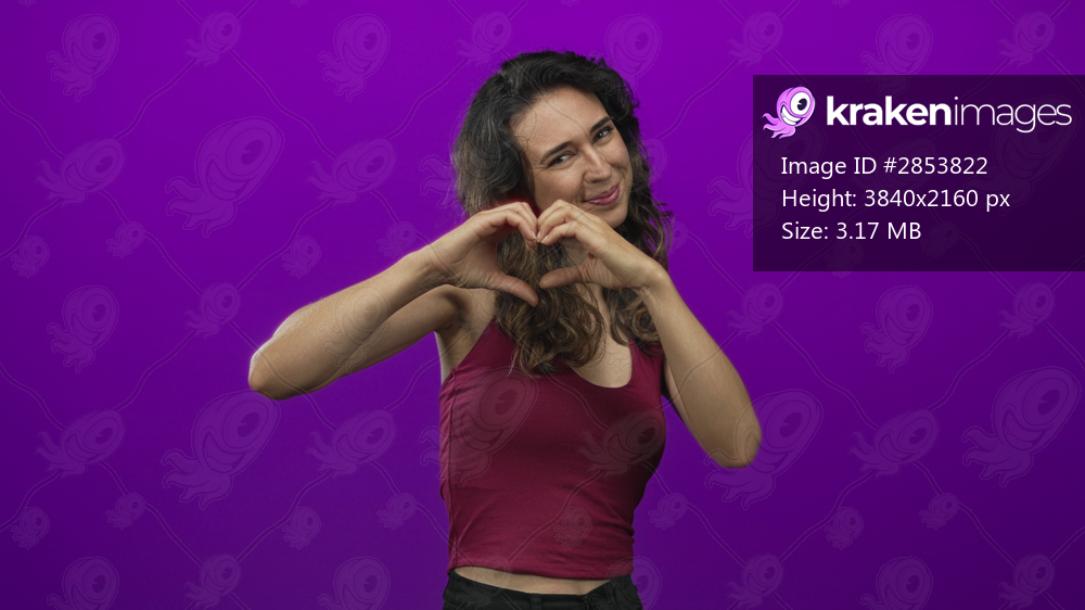 Hispanic woman smiling and hand forming heart gesture while showing peace sign in purple studio; love joy.