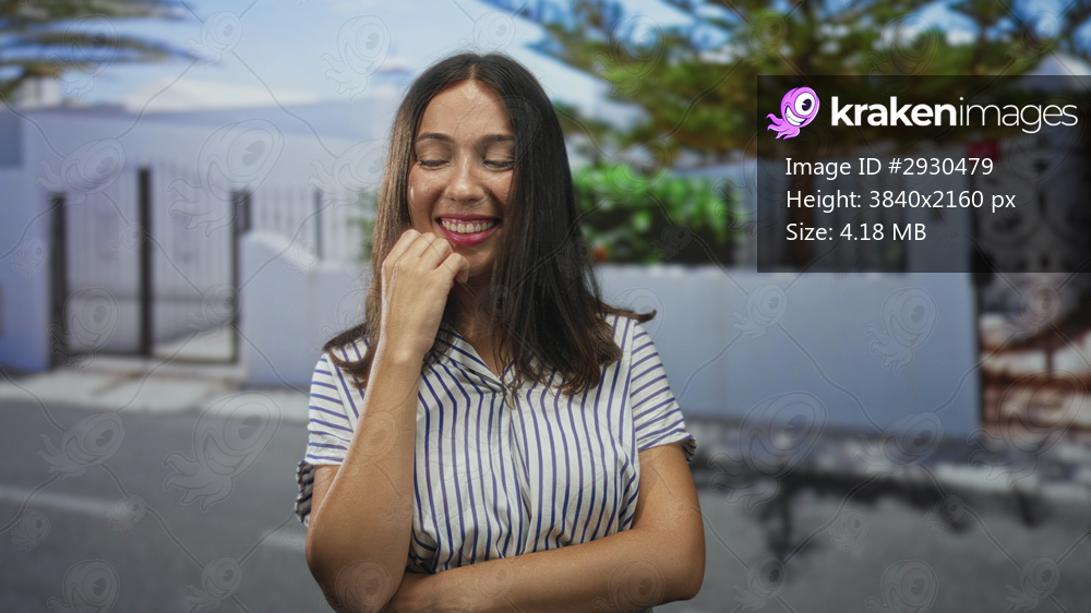 Hispanic woman smiling with hand to chin and crossed arms on street near gated building; confidence.