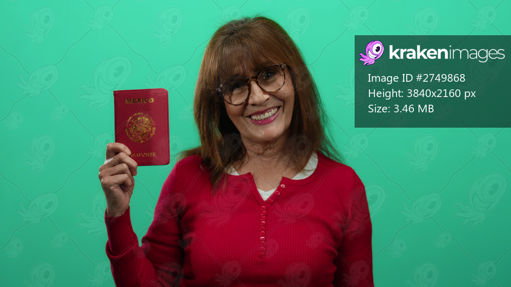 Hispanic woman smiling and holding a mexican passport against a green background, wearing glasses and a red sweater, conveying travel and identity themes. - Kraken Images