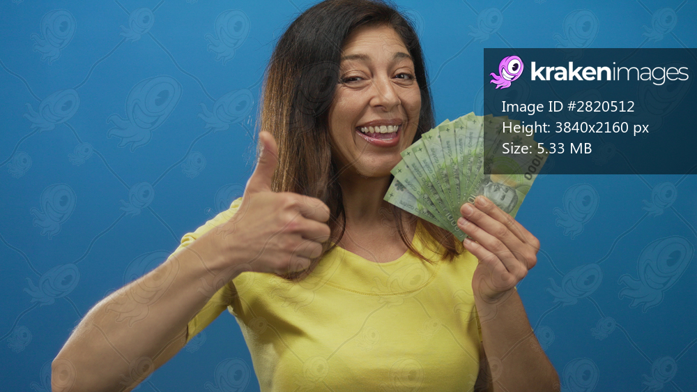 Hispanic woman smiling and holding fan of chilean peso banknotes with thumb up in studio; confidence.