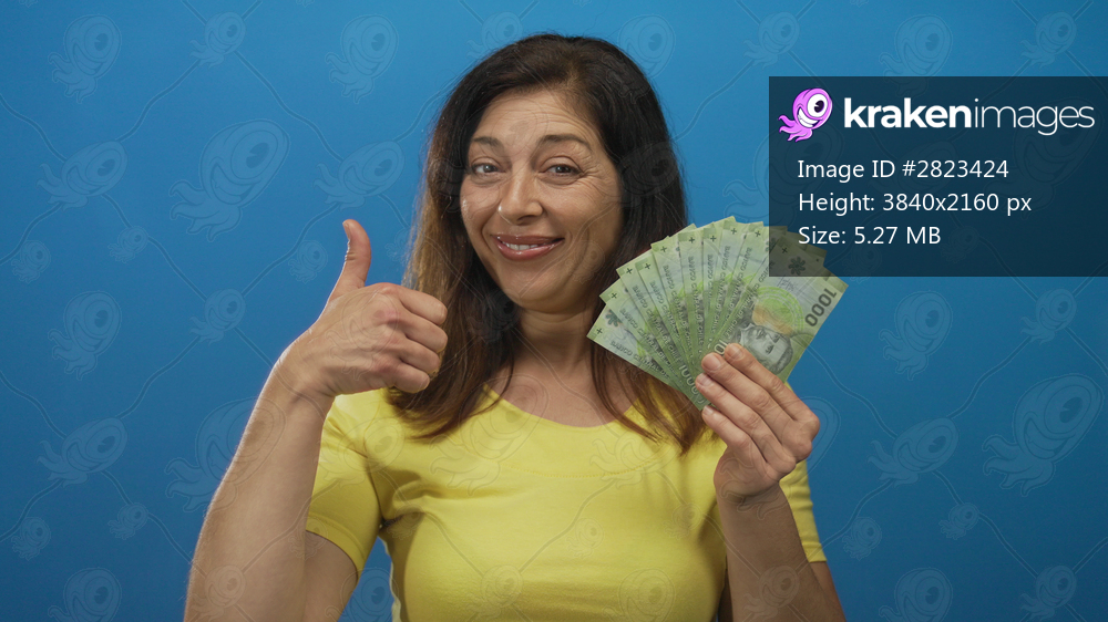 Hispanic woman smiling and holding fan of chilean peso banknotes with thumb up in studio; confidence.